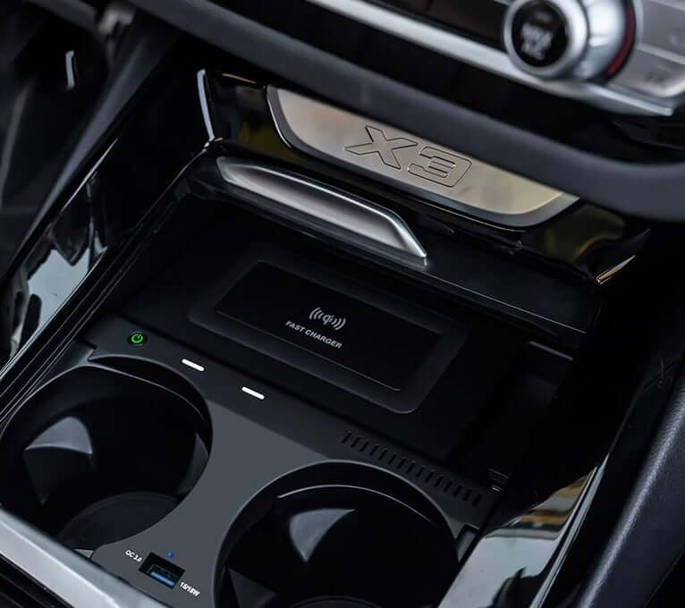 AA&CP offers in-car wireless phone charging on the new BMW X3 X4 2018-2022, BMW X3M X4M 2019-2022, and iX3 2022 (for Left and right diving). Non-destructive installation, just plug-and-play.